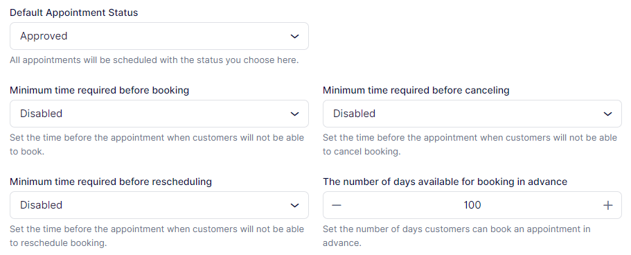 Minimum Time Required Before Canceling allows you to set a minimum time before an appointment when customers cannot cancel. For instance, setting it to “2 hours” means customers cannot cancel an appointment within 2 hours before its start time. By default, this is set to Disabled, permitting customers to cancel at any time, even 5 minutes before the scheduled start.