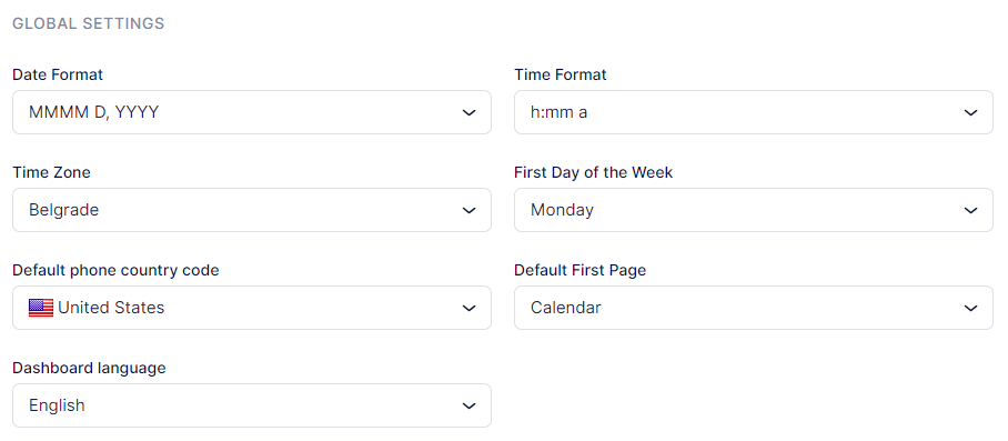 Dashboard Language: Currently, besides English, the dashboard is available in Brazilian Portuguese, Czech, German, French, Serbian, and Spanish. Once translations for other languages are complete, we will implement them as well. If you wish to contribute to Appointr translations, please email our support team at [email protected].