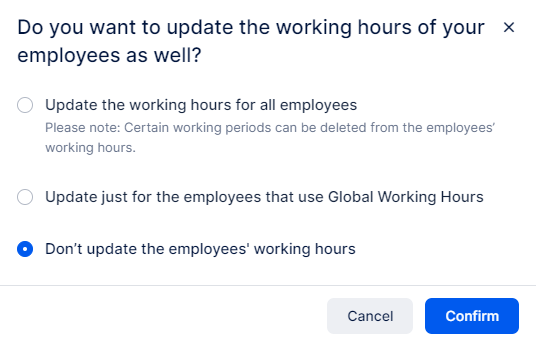 Do Not Update Working Hours: Opt for this option if you prefer not to update the working hours of your employees. This maintains their current individual working hour settings but leaves the changes you’ve made to the Office Hours redundant.
