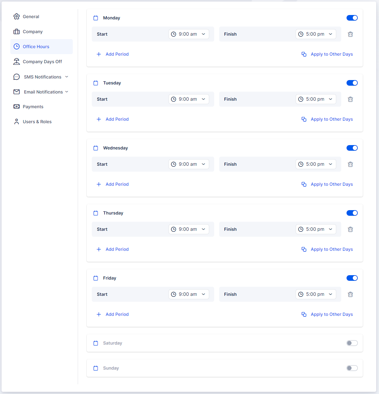 When you access the Settings page of Appointr (located at the bottom left corner of the Admin section), you can configure your Office Hours. By default, they are set from 09:00 – 17:00, Monday – Friday. However, you have the flexibility to customize them according to your business needs.