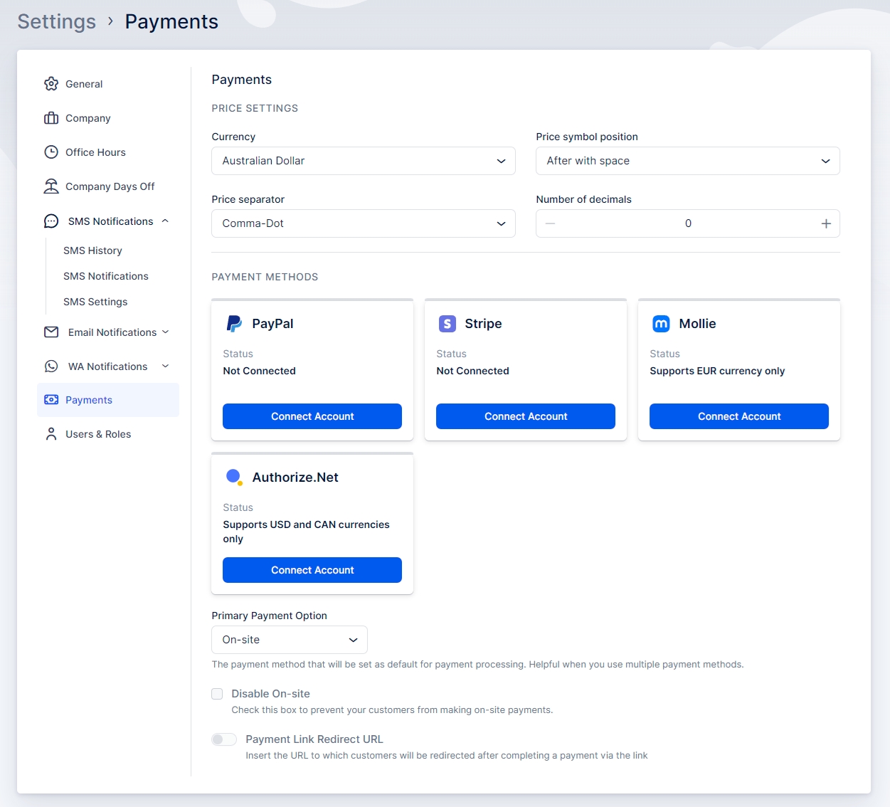 The Payments section in Appointr's Settings allows you to configure the currency that’s going to be used, the price separator, the position of the price symbol, and the number of decimals that are going to be used when the price is presented to your customers.