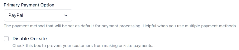 After successfully connecting to at least one online payment method, you have the option to disable on-site payment by checking the checkbox next to “Disable payment on-site.”