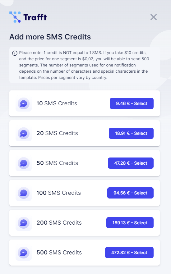 Please note that 1 SMS Credit does not necessarily equate to 1 SMS Message. The cost of each message sent is typically less than 1 SMS Credit per Message. For instance, if the price of one segment is $0.01125 and you purchase $10 credit, you can send approximately 888 segments.