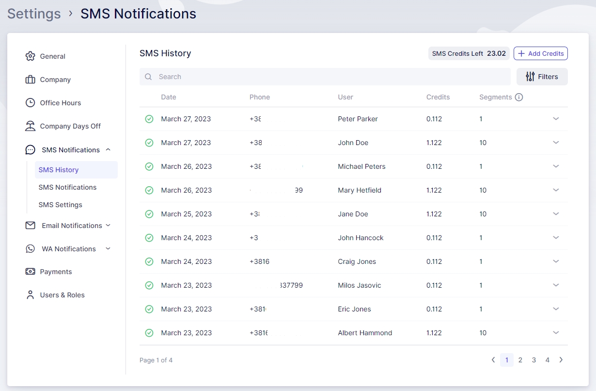 The SMS History tab within Appointr offers a comprehensive summary of all the messages you’ve sent. It presents the date of each message, the recipient’s name and phone number, the credit utilized for sending the message, and the number of segments into which the message was divided. The segmentation, as mentioned before, is influenced by the quantity and type of characters included in the message. Furthermore, you have the option to view the message content by clicking on the dropdown arrow. As usual, you can filter and search through your message history and check the remaining SMS credits.