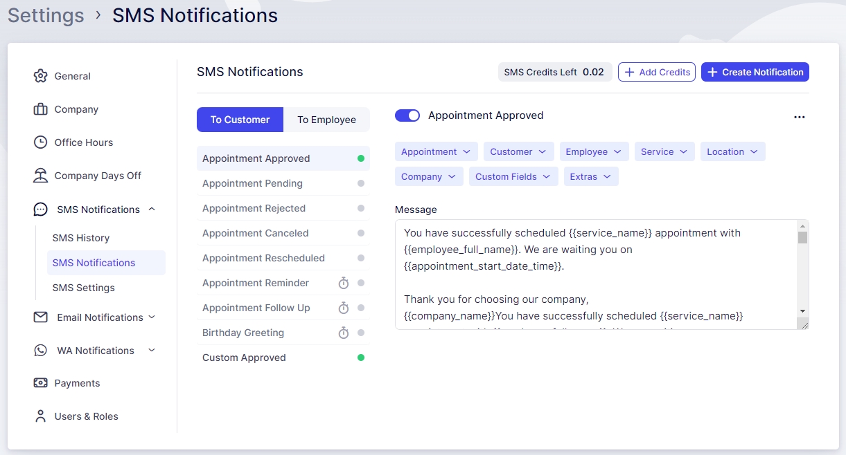 The SMS Notifications tab closely mirrors the Email Notifications tab, allowing you to customize various message types for both Customers and Employees. You can incorporate different placeholders to tailor your message content and determine the timing of your scheduled notifications.