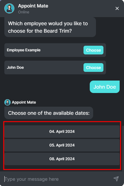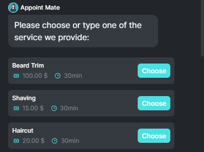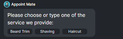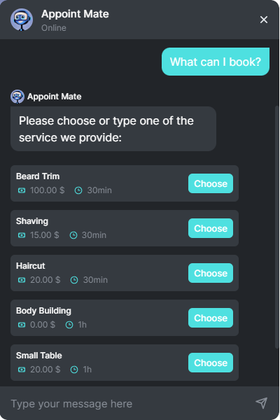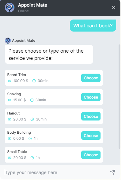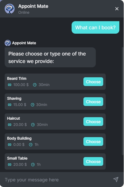 Online Payments: Currently, the Chatbot does not support processing online payments for appointments. Customers will need to pay for their bookings using alternative methods, such as in-person payments or other online payment options available on your website.