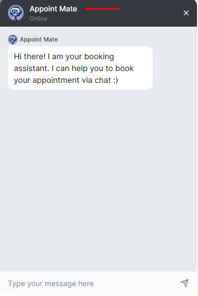 Chatbot Name: Here, you can choose a name for your Chatbot, such as “Bookie Bot,” “Appoint Mate,” “Meet Me Bot,” or any custom name you prefer. This selected name will be visible to users when they start a chat.