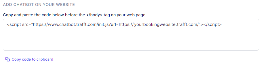 If you’re utilizing an iframe or wish to integrate the Appointr Chatbot on your personal website instead of displaying it on your booking page, you can copy and paste the following code just before the </body> tag on your webpage.