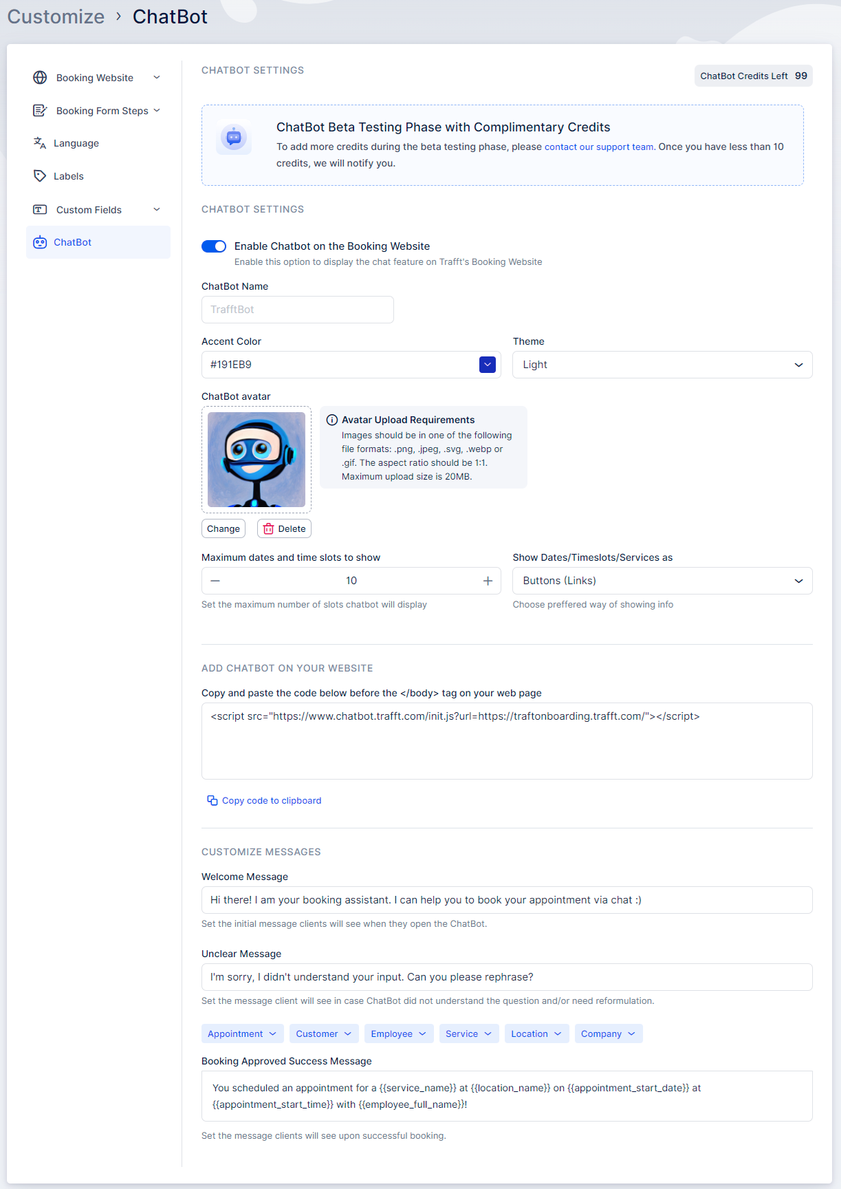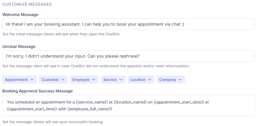 Enable Chatbot on the Booking Website: Activating this option integrates the Chatbot into your Appointr booking form, providing your clients with the convenience of scheduling appointments through the Chatbot interface.