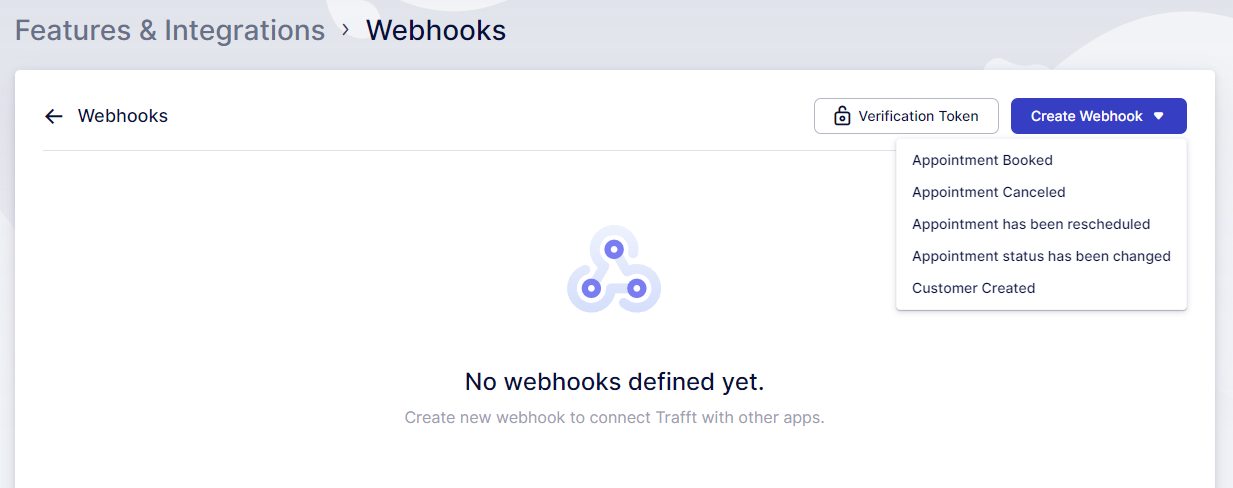 Please note that, at this stage, you can only create a single webhook for each type. This means there can be only one ‘Appointment Booked’ webhook, one ‘Appointment Canceled’ webhook, and so on.