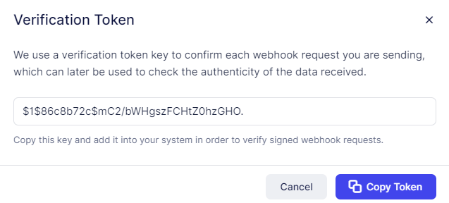 When setting up your Webhooks in Appointr, you have the option to utilize a ‘Verification Token‘. Clicking on this button (next to the “Create Webhook” button) will prompt a pop-up window where you can view and copy your verification token.