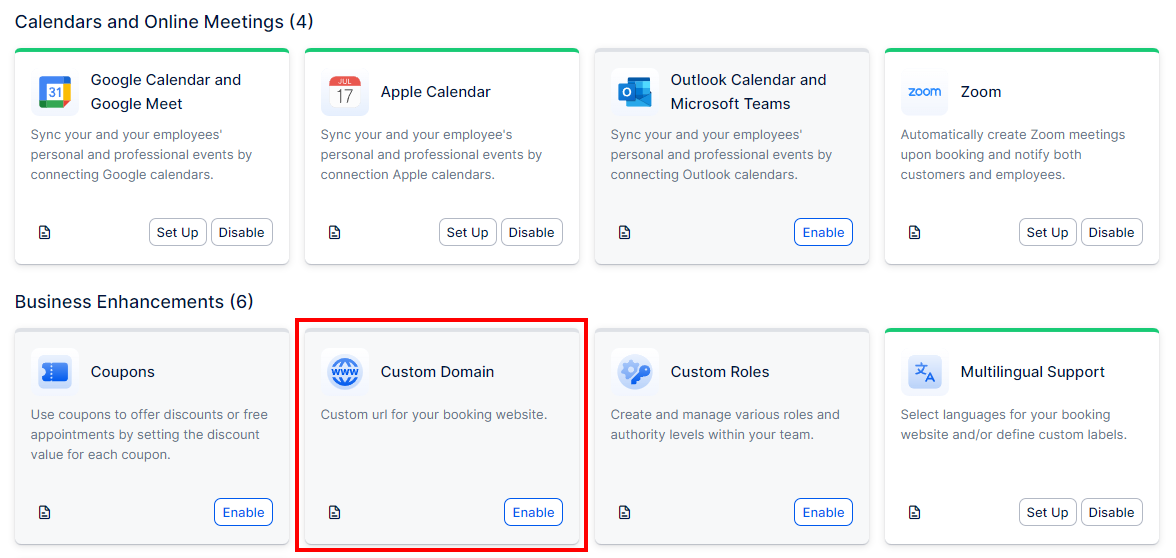 After enabling the feature, the card will refresh, and you’ll see a ‘Set Up‘ button. If you ever need to disable the custom domain, the ‘Enable’ button will change to ‘Disable‘.