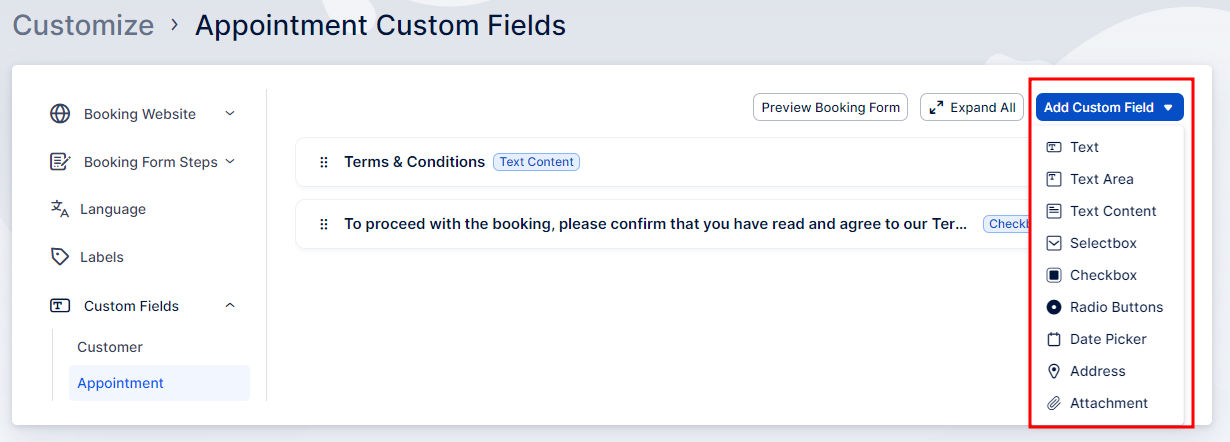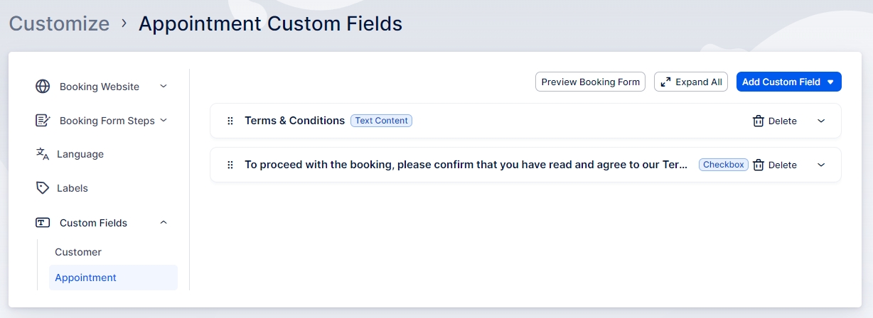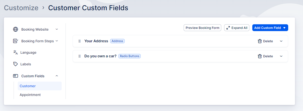 Custom Fields are valuable for gathering necessary customer information before appointments and are also known as Extra Form Fields or Intake Forms. You have the option to create questions or inputs that will be incorporated into the final stage of the booking form.
