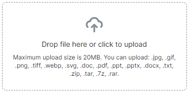 Maximum upload size is 20MB. You can upload: .jpg, .gif, .png, .tiff, .webp, .svg, .doc, .pdf, .ppt, .pptx, .docx, .txt, .zip, .tar, .7z, .rar.