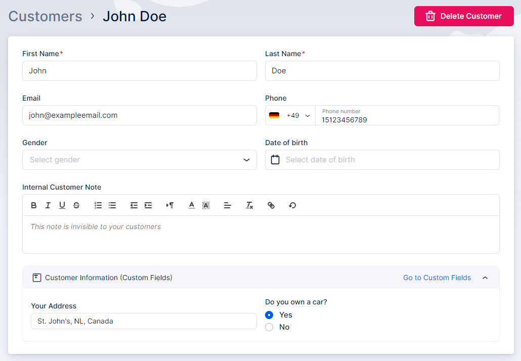 Once the customer-related custom fields are filled, they will be available in the Customers section, when you edit or view the customer: