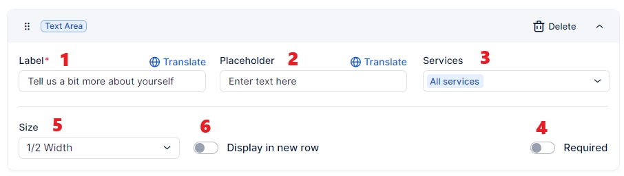 Text Area – similar to a text field but allows for larger amounts of text to be entered. It is limited to 1.000 characters.