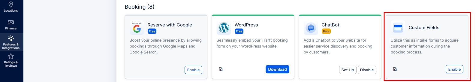 As for all custom features, you need to access the Features & Integrations section, scroll down, and locate the Custom Fields. You need to click on “Enable” in order to use it.