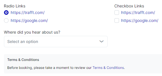 URLs added in the Radio Button, Checkbox, and Text Content custom fields will be displayed as links on your booking form, so you can also guide your customers to other pages through these links
