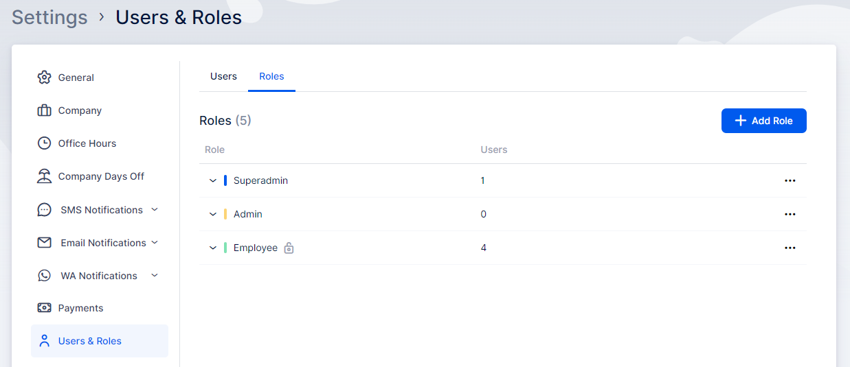 In Appointr, you can assign predefined roles such as Employee, Admin, or Superadmin to your users. These roles come with default permissions. Alternatively, you can create custom roles with specific permissions tailored to your needs. Custom roles allow you to control the level of access and management for each user by specifying which Appointr entities they can view, manage, or delete.