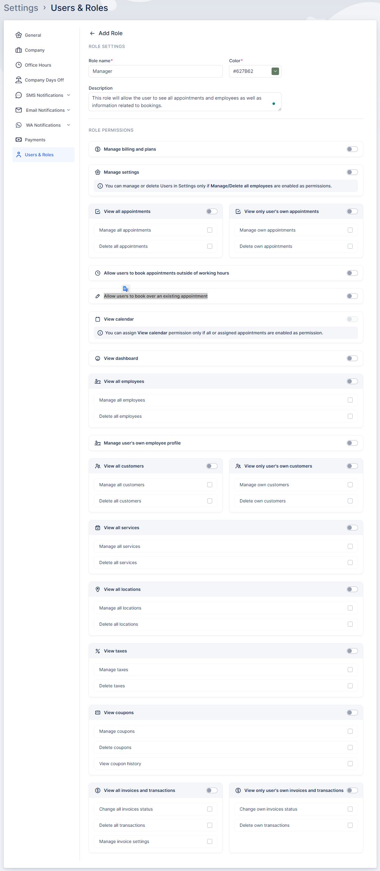 Allow users to book appointments outside of working hours: Enabling this option allows the role-holder to book appointments outside of employees’ working hours, effectively overriding the employee’s schedule. (This option can also be enabled in the default Admin and Superadmin roles)