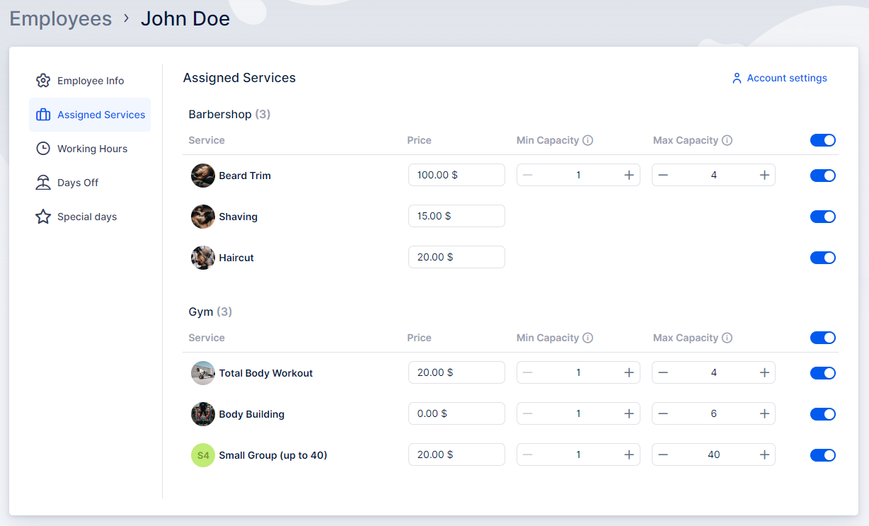 For each enabled/assigned service, you can set a specific minimum and maximum capacity for the employee.