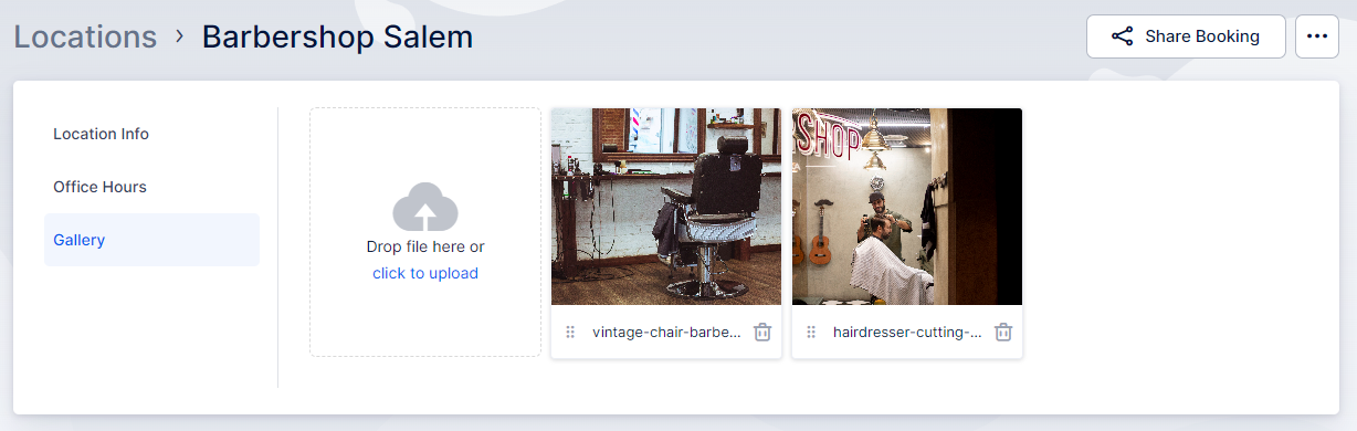 Gallery – Once you edit the Location, you have the option to create a location gallery that showcases images of your location. This gallery will be displayed to customers when they are making a booking and select a specific location.