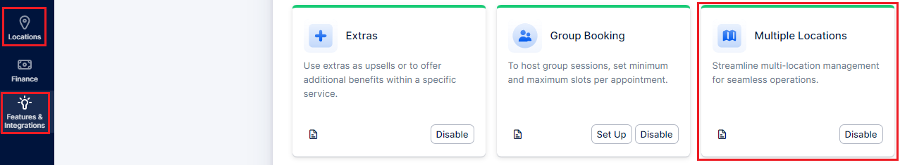 When you access this page, you’ll know the feature is active if you see the “Disable” option displayed on its card. Conversely, if the feature is not yet activated, it will not appear in the left-side menu. Once confirmed, click on the “Locations” option to start creating your locations.