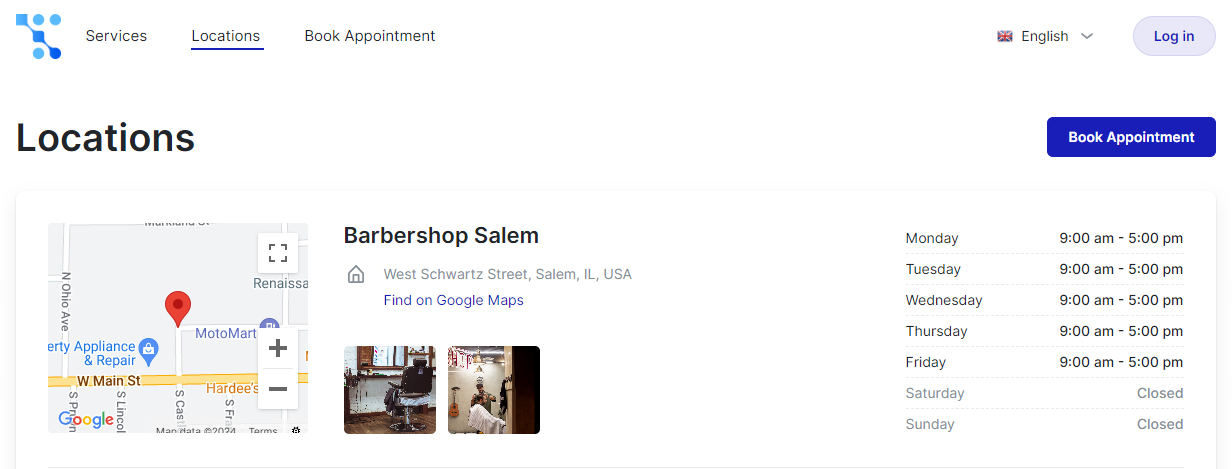 Once you have configured the office hours and uploaded photos for a location in Appointr, this information will be prominently displayed on your Booking website, on the Locations page.