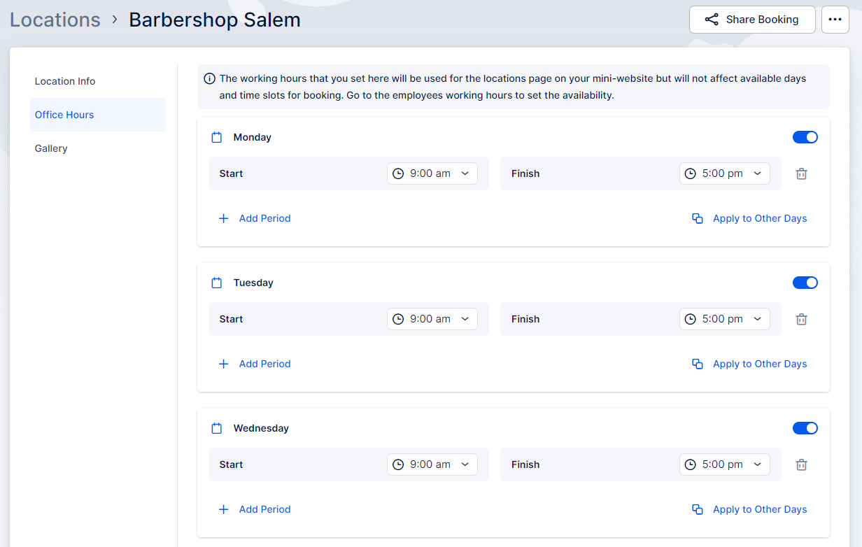 After adding a location, you can further customize it by setting up specific office hours. To do this:
