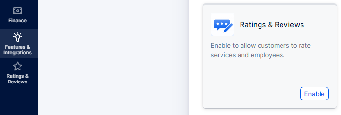 To enable Ratings & Reviews for your account, access the Features & Integrations section, locate (or search for) “Ratings & Reviews” and simply click on the “Enable” button:
