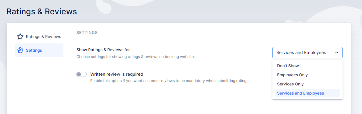 In the Settings tab, you’ll be able to choose whether reviews on your booking website will be shown for both Employees and Services, only Employees, or only Services. You can also choose not to show them on the booking website, so they’re used only for internal purposes.