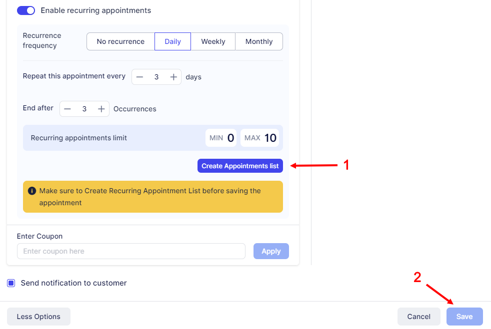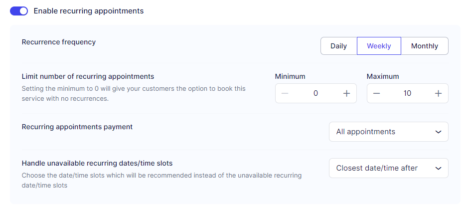 Limit number of recurring appointments – Here, you can set either a minimum or maximum number of appointments required for a recurring booking. Setting the “Minimum” to “0” enables customers to choose between regular (non-recurring) appointments and recurring ones.