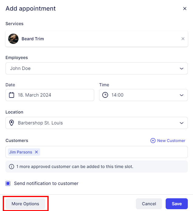 When filling in a new appointment through the back-end, click on “More Options” to open a detailed view: