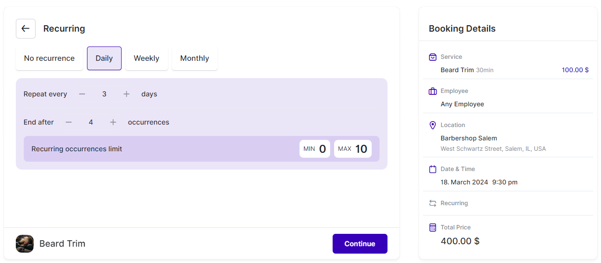 On your booking website, customers will find the option to book a recurring appointment for services with the enabled Recurring Appointments setting. When booking a Daily recurrence (for example), they will see the following options under the date and time selection: