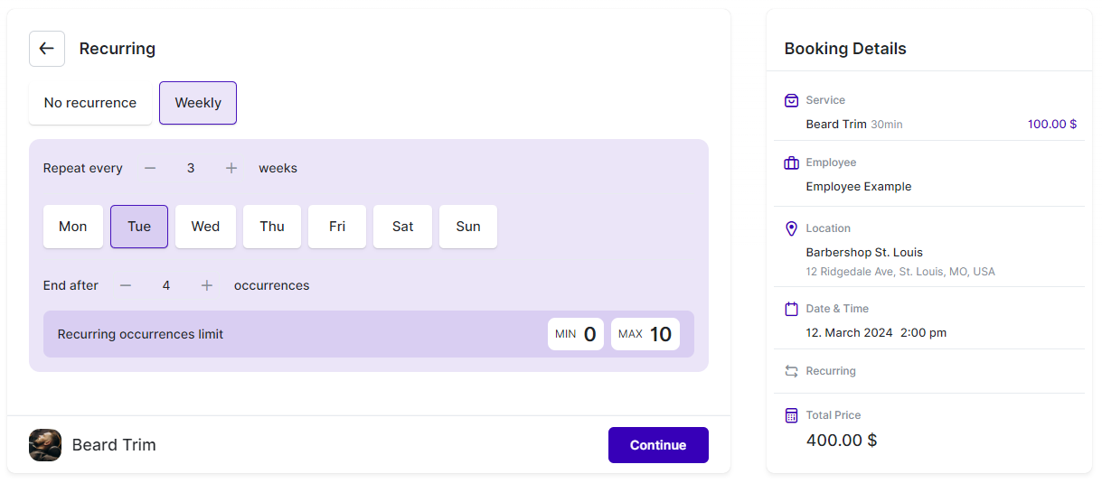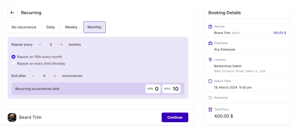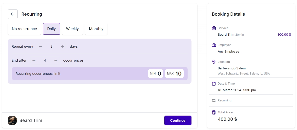 The Recurring Appointments feature enables customers to book an appointment that repeats multiple times. They can select the date and time for the initial appointment, and then specify the recurrence type and the number of repetitions within a single booking process.