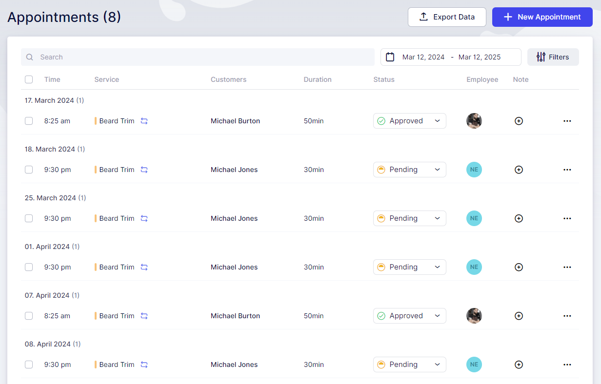 Once a Recurring Appointment is scheduled on the booking website by your customer, you will be able to see all of them on your Appointments page, identified by the repeating symbol next to the name of the service.