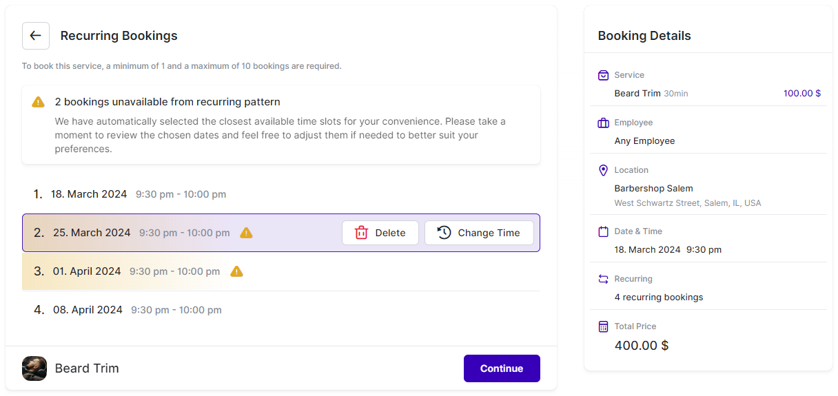 Once your customers have selected how they want to schedule their recurring appointments, they will see a list displaying all the appointments with the corresponding dates and times. If a particular time slot has been modified due to unavailability, it will be indicated. Customers can edit each appointment in the list to change the time or even delete the appointment altogether.