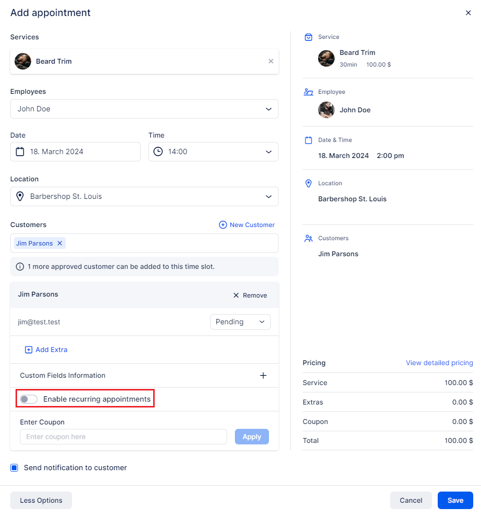 Once the service name, employee, date, time, and customer fields are populated, the option “Enable recurring appointments” will become available: