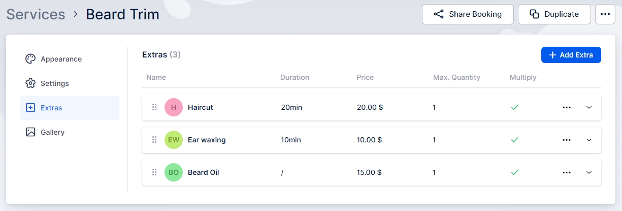 Extras are designed to provide you with the option to create additional services or products that complement your primary service. This allows your customers the flexibility to choose whether they want to add something extra to their appointment.