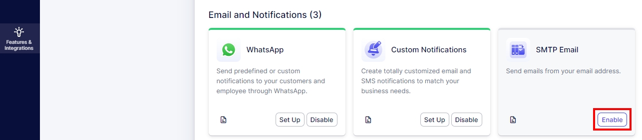 Locate the “SMTP Email” feature and click on “Enable” to activate it.