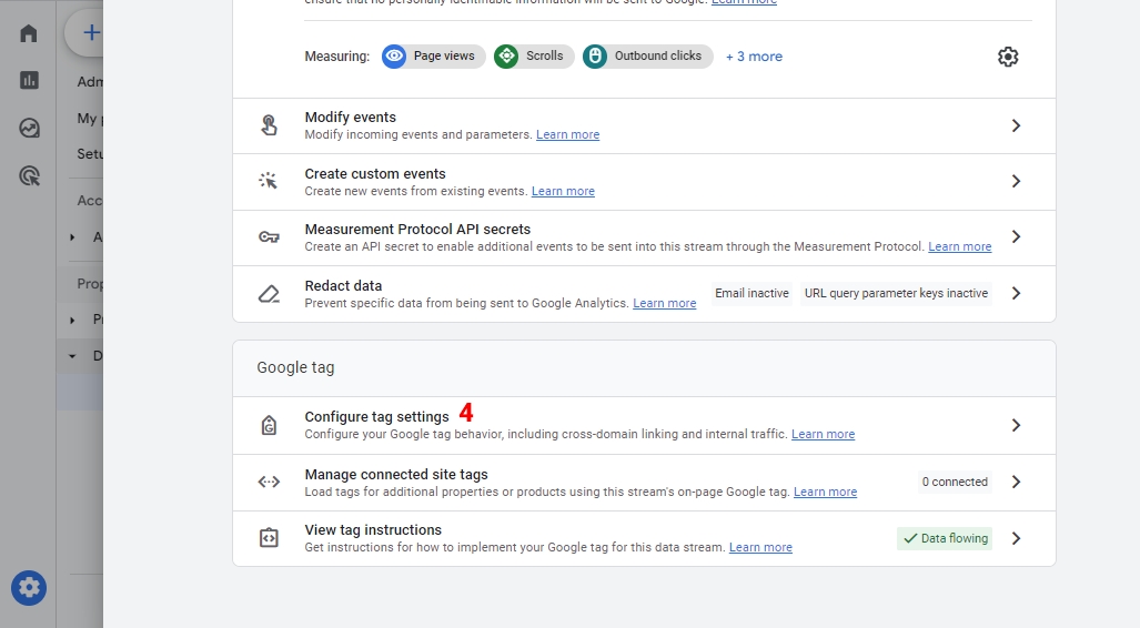 Step 1: Click on the “Admin” (Gear) icon in the bottom left corner -> Data Streams, then select the web data stream.