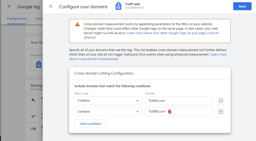 Step 4: Enter all domains that should be included in the cross-domain tracking setup and then click “Save” in the upper right corner: