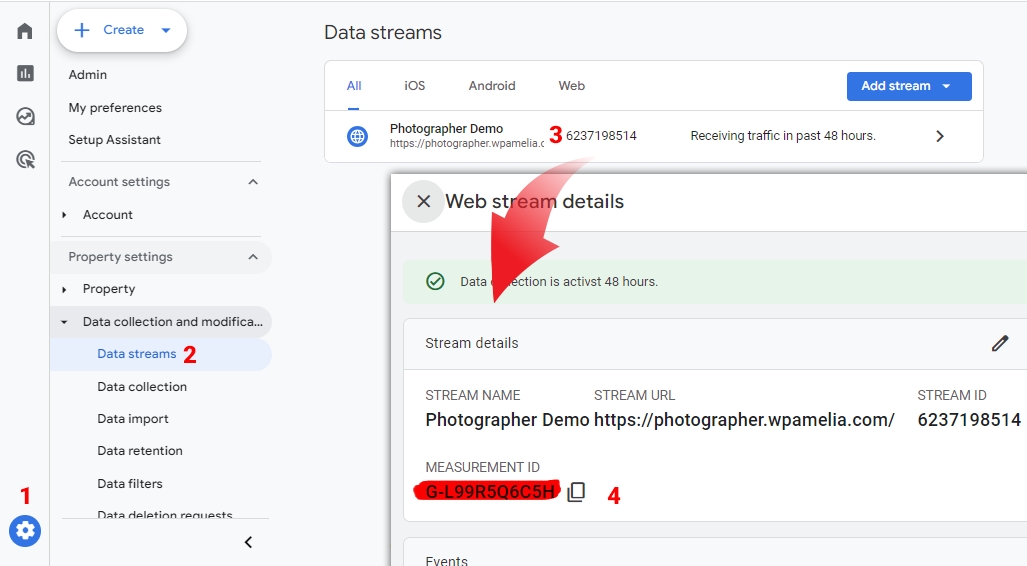 Access your Google Analytics 4 page, and click on the “Admin” (Gear) icon located in the bottom left corner. Next, navigate to “Data Collection and Modification” and then “Data Streams“. Here, you will find your existing Data Streams. Click on your specific stream to view and copy the Measurement ID:
