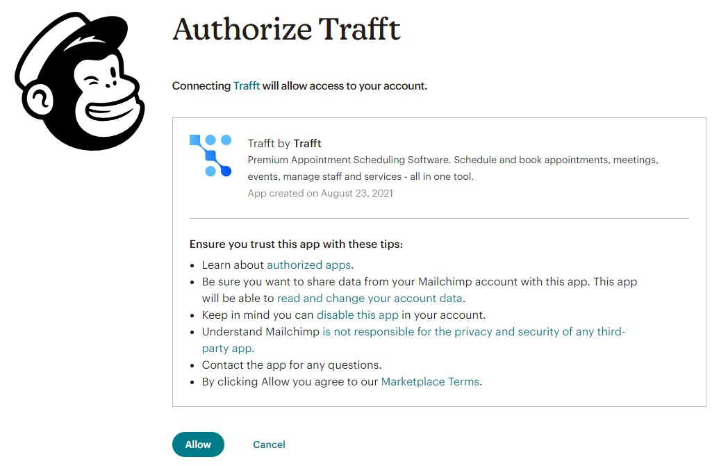 After clicking the “Connect Account” button, you will be prompted to log in to your Mailchimp account if you are not already logged in. Once logged in, you will see a prompt asking you to allow Appointr access to your Mailchimp account. Click the “Allow” button to proceed.