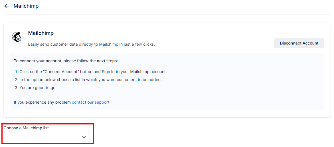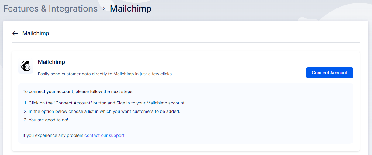 The new page will open, providing instructions on how to connect your Mailchimp account. Start by clicking the “Connect Account” button to begin the setup process.