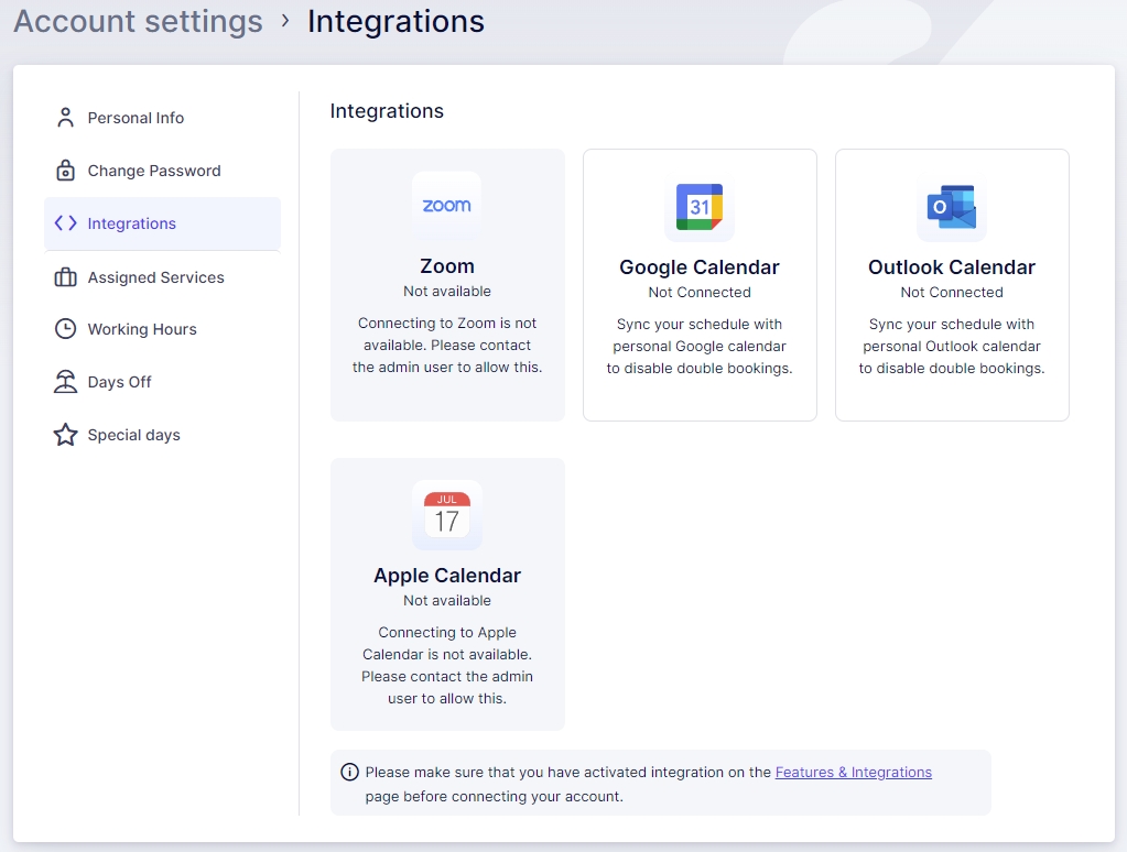 If you decide to assign a calendar to an employee, the dropdown will expand and display all the calendars created in the Outlook Account linked with Appointr. The assignment of one of these calendars to an employee is demonstrated by “Employee Example” in the screenshot above. Once an employee is linked in this way, they will not be able to connect their personal Outlook accounts through Account Settings/Integrations. If they attempt to access this section, they will see the following notification: