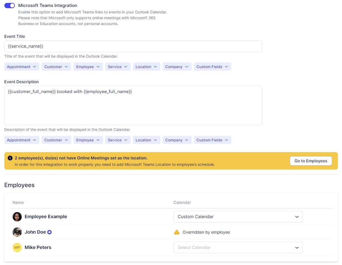 Once activated, Appointr may display a yellow warning above the employees list, indicating that there are employees connected to Outlook Calendar who have not set Online Meetings as the location. To address this, click on the “Go to Employees” button, which will direct you to the Employees section, our next step regardless.