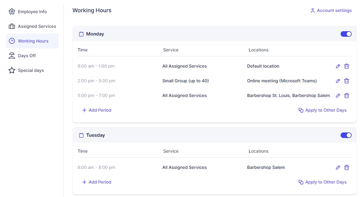 In this case, the employee will cover the Default Location (that doesn’t have to be Microsoft Teams, depending on your configuration) on Mondays, but only from 08:00 am – 1:00 pm, then he’s covering Microsoft Teams exclusively from 2:00 pm – 5:00 pm (this means that the employee will always cover Microsoft Teams even if the default location is changed), and finally, he covers two physical locations from 5:00 pm – 7:00 pm. As showcased in the screenshot above, you can select multiple locations during the employee’s working hours, and you can create multiple working periods so the employee covers different locations per period.