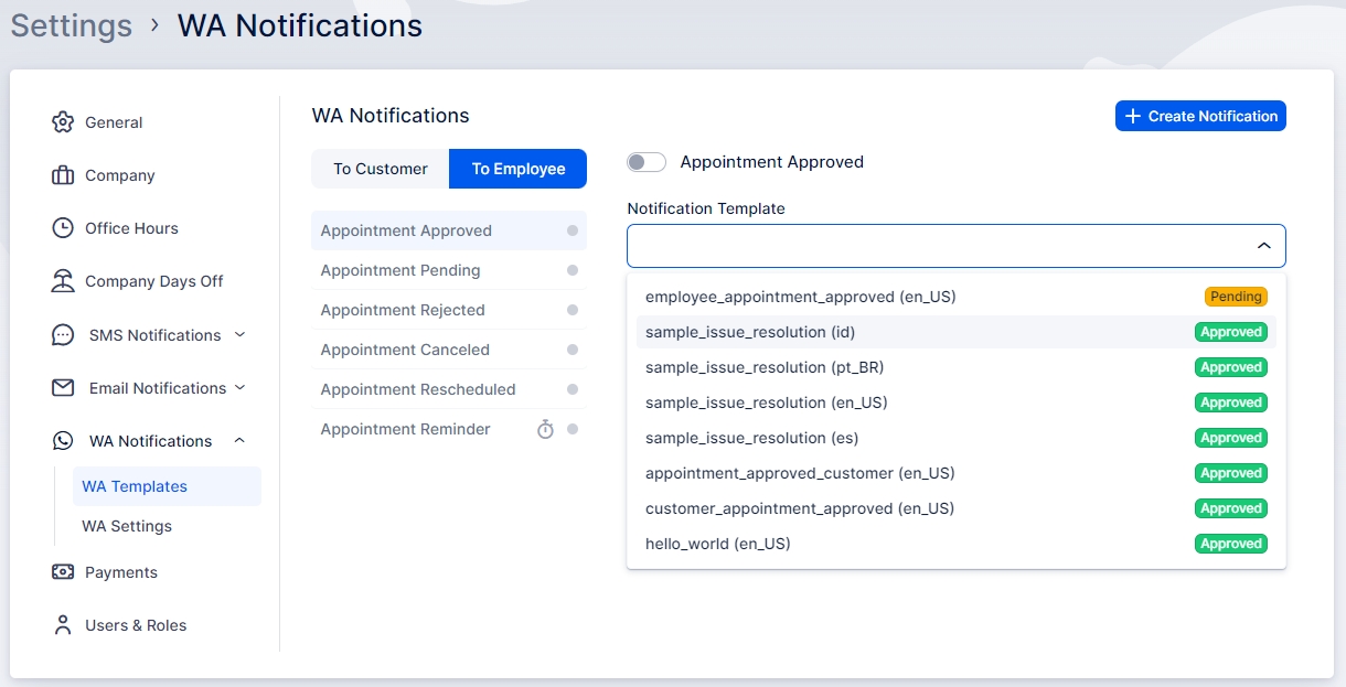 Back in Appointr’s Settings/WA Notifications/WA Templates (once you refresh the page), when you click on the “Notification template” drop-down, you will see the list of all templates created in the app (both approved and pending ones).