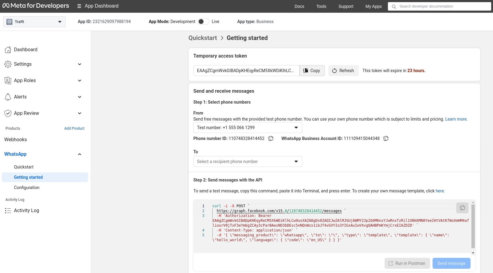 This will take you to the “Getting Started” section, which provides essential data for testing the app: a Temporary Access Token, Phone Number ID, WhatsApp Business Account ID, and the Curl command for sending messages.